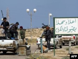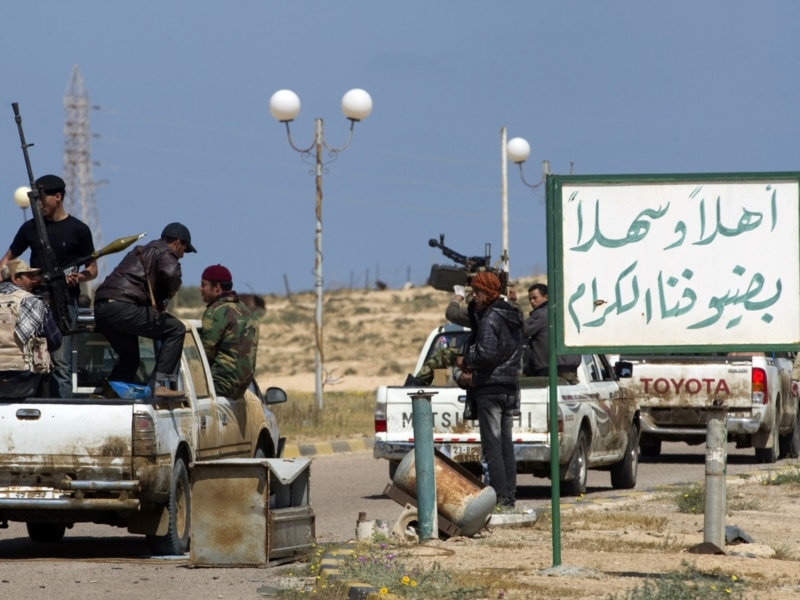 Колона лівійських повстанців проїзджає повз вітальну вивіску портового міста Бреґа, 4 квітня 2011 року