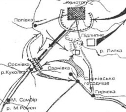 Конотопська битва 1659 р.Союзники збиралися йти на Москву, проте у них в тилу за підтримки московського уряду повстали лівобережні полковники Тиміш Цюцюра, Василь Золотаренко та Яким Сомко. Натомість запорожці на чолі з Іваном Сірком напали на стійбища ногайців на півдні України, а звідти рушили на гетьманську столицю Чигирин. Відтак, замість походу на Москву, Мехмед-Ґірей поспішив рятувати Крим та ногайські землі, а Виговський – Чигирин. Скориставшись цим, Цюцюра розгромив козацькі загони на Сіверщині і урочисто запросив московське військо Трубецького вступити в Україну.