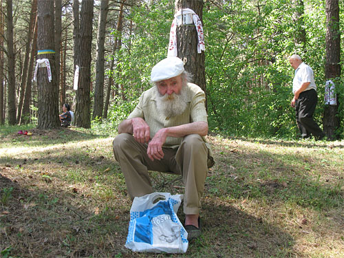 |  |  | Віталій Мацюк торік наступив на череп. Він приїжджає сюди щороку аж з Білої Церкви, що на Київщині. Йому уже за 80, він присів обабіч на землі, бо ноги вже підводять. Його мова уже дуже не зрозуміла і тиха, він весь час плаче: «Батько й сусіди тут. Кого спіймають, того й розстрілюють. Голодомор пам’ятаю. Собак їли, людей їли. Я в Києві лежав у лікарні, мені пощастило, мене не з’їли, не помер, і в лікарні не заморили». Слухати: