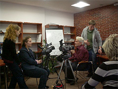 Молоді польські волонтери в рамках програми "Нотації" готуються у приміщеннях Інституту національної пам''яті до проведення відеозапису спогадів очевидця історичних подій.