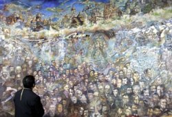 Картини Романа Бончука «Мегаісторія України»Роман Бончук: «У будь-якому випадку вона б сталась, праця над цим полотном, бо попередньо було безліч спроб, досліджень історії меншими полотнами. Було бажання найширше і найглибше виявити різні сторінки історії. Саме цікаве, що при закінченні роботи мені і 30 метрів замало для всієї історії».