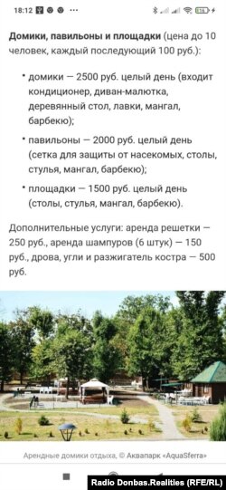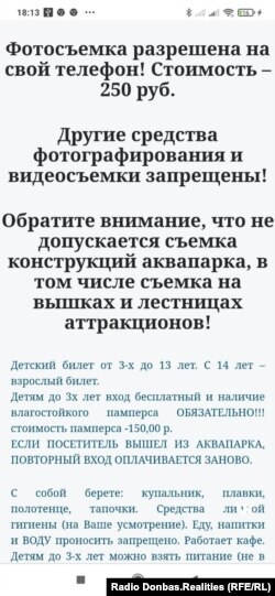 И действительно: только при нас несколько человек отказались посетить этот оазис в городской черте по причине довольно-таки недемократических цен. За вход с одного человека за 4 часа пребывания в аквапарке следует отдать 450 руб. (около 170 грн.). Если любитель поплавать в бассейне желает пробыть там целый день, нужно заплатить 650 руб. (250 грн.). Учитывая, что по одному в аквапарк, как правило, не ходят, получается отдых на круглую сумму. В оккупированном городе не каждая среднестатистическая семья со своим скромным бюджетом сможет позволить «промотать» за один день в бассейне такие деньги. И это без учета питания и воды. Кстати, проносить с собой какую-либо еду, за исключением питания для детей до 3-х лет, запрещено, как и воду. Фотографироваться тоже платно – 250 руб. (почти 100 грн.) – и только на телефон.