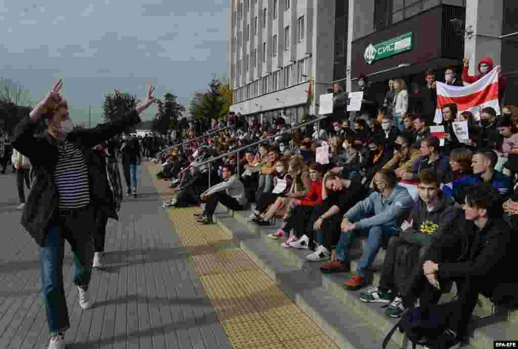 Студенти зібралися під стінами Білоруського державного університету інформатики та радіоелектроніки в Мінську 30 вересня на підтримку одногрупників, які були затримані під час акцій протесту проти Олександра Лукашенка. За даними правозахисного центру «Вясна», після 9 серпня, коли в Білорусі пройшли президентські вибори, було затримано понад 12 000 осіб. Учасники протестів вважають оголошені ЦВК Білорусі результати виборів сфальсифікованими, а жорстокість, до якої вдається білоруська влада – порушенням прав людини. Країни ЄС, країни Балтії, Канада, Велика Британія, Україна та інші країни не визнали інавгурацію Лукашенка.