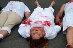 Хлопці та дівчата, одягнуті в біле, спершу лягли на асфальт горілиць, потім перевернулися на живіт, зрештою – стали навпочіпки й піднялися. Увесь цей час по їхніх тілах проходив імпровізований «закривавлений» коток з металевих ґрат.