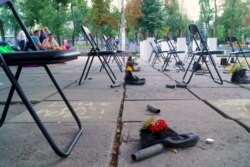 Цього дня біля музею створили інсталяцію «Разом. Пам’ятаємо» – зі спиляних дерев, свічок та гільз. Для тих, хто загинув, поставили символічні порожні стільці. Поряд – 22 пари берців.