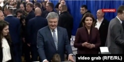 Чинний президент Петро Порошенко, який також балотується на другий термін, прибув для голосування до виборчої дільниці в Будинку офіцерів разом з дружиною Мариною та дітьми.