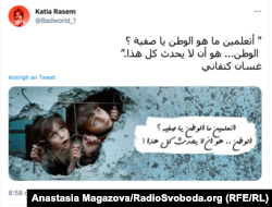 Второе фото, которое также является продуктом пропаганды, показывает двоих детей, выглядывающих из развалин. Этот фейк ранее не получал широкой огласки. Однако удалось установить первоисточник – это фото впервые было опубликовано сирийским поэтом на его странице в Twitter 4 июля 2013 года – то есть задолго до начала российской агрессии против Украины. Сегодня же организаторы фотовыставки использует это изображение сирийских детей в качестве иллюстрации войны на Донбассе.