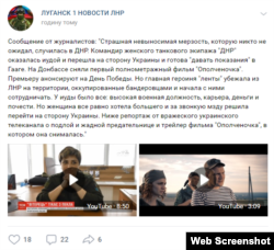 Цінний свідок: Служба безпеки України підтвердила виведення на підконтрольну урядові територію танкістки угруповання «ДНР» Світлани Дрюк. СБУ каже, що найманка винесла важливу інформацію про структуру російських сил на Донбасі. Про те, що прототип «Ополченочки», танкістка Світлана Дрюк, перейшла на бік України і, власне, вже давно працює на українську розвідку, розповів напередодні в телепрограмі «ТСН» на каналі «1+1» журналіст Андрій Цаплієнко. В «офіційному» полі угруповань «ЛДНР» – наразі лише заява з Донецька, в якій «спростовують» повідомлення СБУ про перехід жінки на бік України і стверджують, ніби СБУ «викрала» її і чинить тепер на неї «бузувірські методи впливу». А от реакція на нібито непідконтрольному окупаційним адміністраціям полі – у соцмережах – на дещо вказує.