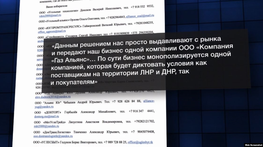 Монополістом на поставку і збут продукції з окупованих районів Донецької та Луганської областей стала фірма «Газ-альянс» українського олігарха-втікача Сергія Курченка. Навесні цього року Міністерство економіки Росії безпосередньо заборонило іншим трейдерам контактувати з угрупованнями «ЛНР» і «ДНР». Ображені російські фірми навіть написали колективний лист президентові Росії Володимиру Путіну. Але безрезультатно. Структури Курченка продовжують контролювати трафік вугілля і металу.