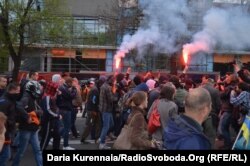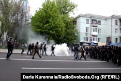 Пісню доспівати не вдалося. З криками «Росія» на ходу понеслися люди в балаклавах. Вони були озброєні битами, газовими балончиками, ціпками, травматичними пістолетами та ножами. В ходу летять петарди і каміння. У якийсь момент лунає вибух: в ходу кинули світлошумову гранату.