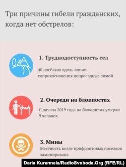 Помимо очередей и плохо оборудованных блокпостов, еще одной причиной смертей является труднодоступность посёлков вдоль линии разграничения. А третья причина – мины, говорит Каплин.