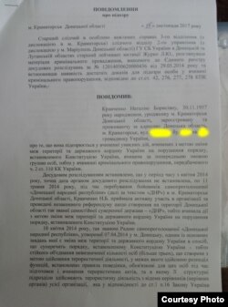 Досудебное следствие шло с ноября 2017 года – женщине предъявили обвинение после изучения следователем материалов старого производства 12014050620000436, которое объединяет всех предполагаемых участников и организаторов так называемого «волеизъявления граждан» на Донбассе.