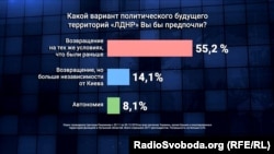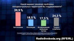 У вже згаданому опитуванні, яке провели на початку травня, українців також запитали – який варіант вирішення проблеми непідконтрольних територій вони бачать? Обрати запропонували з трьох варіантів. Відтак майже 40% респондентів підтримали особливий статус у складі України.