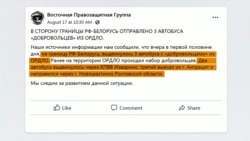 «На кордон Російської Федерації і Білорусі вирушили три автобуси з «добровольцями» з ОРДЛО. Два автобуси вирушили через КПВВ «Ізварине», третій виїхав із міста Антрацит і попрямував через місто Новошахтинськ Ростовської області», – зазначили у «Східній правозахисній групі».