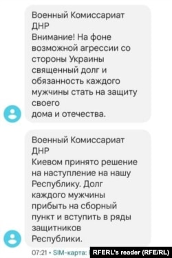 Отдельная тема – информационная война. Людям приходят разнообразные сообщения в смс и вайбере: например, о том, что все переписки и звонки будут записываться (Радио Донбас.Реалии получило четыре таких сообщения от разных людей за сутки); ну и, конечно, о мобилизации.