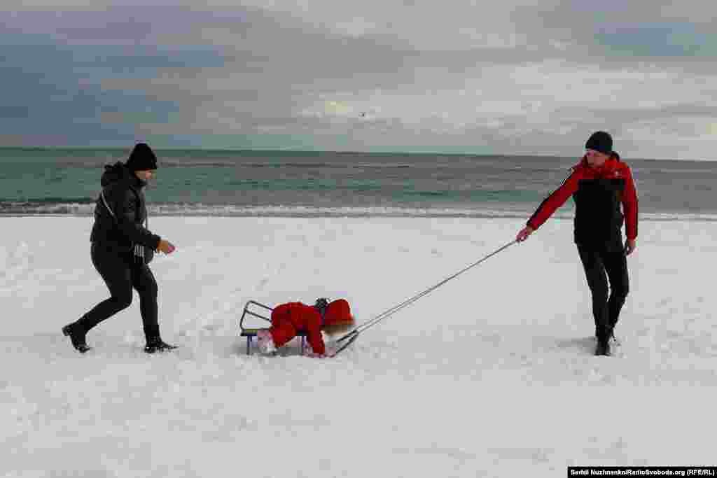 Одесити з маленькими дітьми вийшли кататись на санчатах на пляж «Ланжерон
