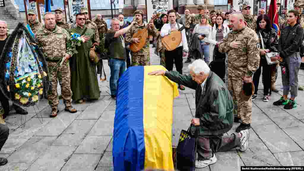 Люди, які прийшли попрощатися із загиблим воїном, принесли червоно-чорні й жовто-сині прапори, знамена «Легіону Свобода» та «Карпатської Січі»