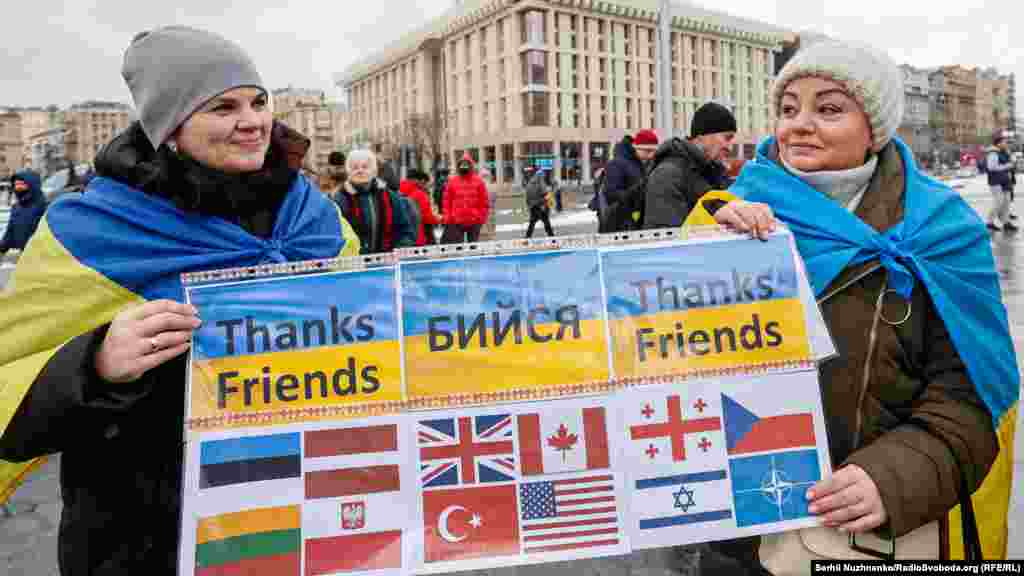 У Києві на Майдані Незалежності відбулася акція вдячності союзникам України «Thanks friends». Організатором акції стала українська політична партія та громадська організація «Демократична Сокира».