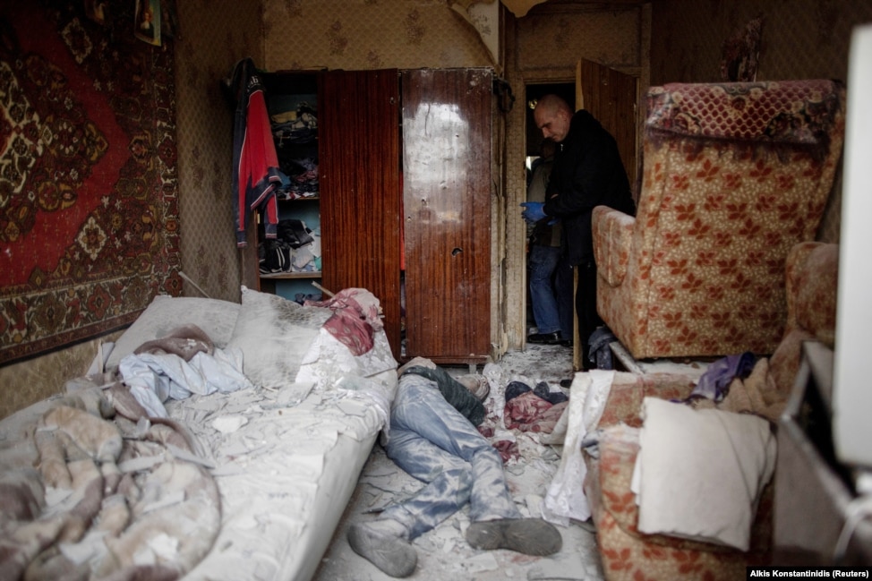 Представник ДСНС України стоїть над тілом 41-річного жителя, який загинув у своїй квартирі внаслідок російського обстрілу. Харків, 13 квітня 2022 року