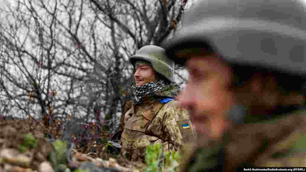 Військовий посміхається, коли один із його побратимів розповідає історію з життя. Донецька область, 22 квітня 2022 року