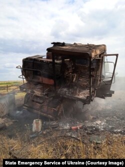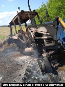 На цьому знімку (вгорі) від 30 липня – знищений на протитанковій міні комбайн у Харківській області. За повідомленням, водій після вибуху вижив і був госпіталізований.