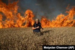 На цьому фото від 29 липня український фотожурналіст Євген Малолєтка на палаючому пшеничному полі в Харківській області.