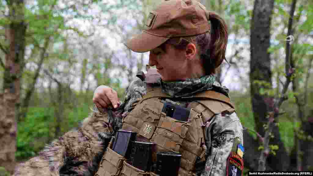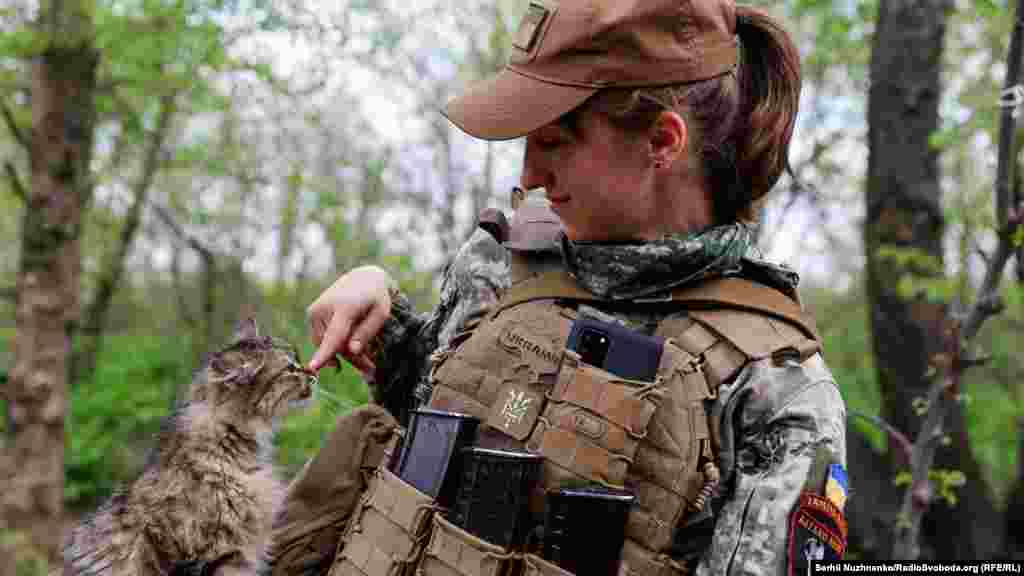 Українська військова Наталія гладить кота на передовій позиції. 28 квітня 2022 року
