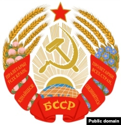 Блакитні квіти льону (праворуч) і рожева конюшина прикрашають герб радянських часів. Білорусь має давні традиції виробництва лляних волокон.