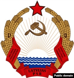 Смуга Балтійського моря, зображена на латвійському гербі, створила символічну дилему у зв’язку із соціалістичним «сходом сонця», необхідним для всіх радянських гербів. Латвійське узбережжя виходить на захід, а це означає, що над Балтійським морем видно лише захід сонця. Ця груба помилка в композиції призвела до жартів про занепад соціалізму в Європі. Латиський напис у нижній частині герба означає «Латвійська РСР».