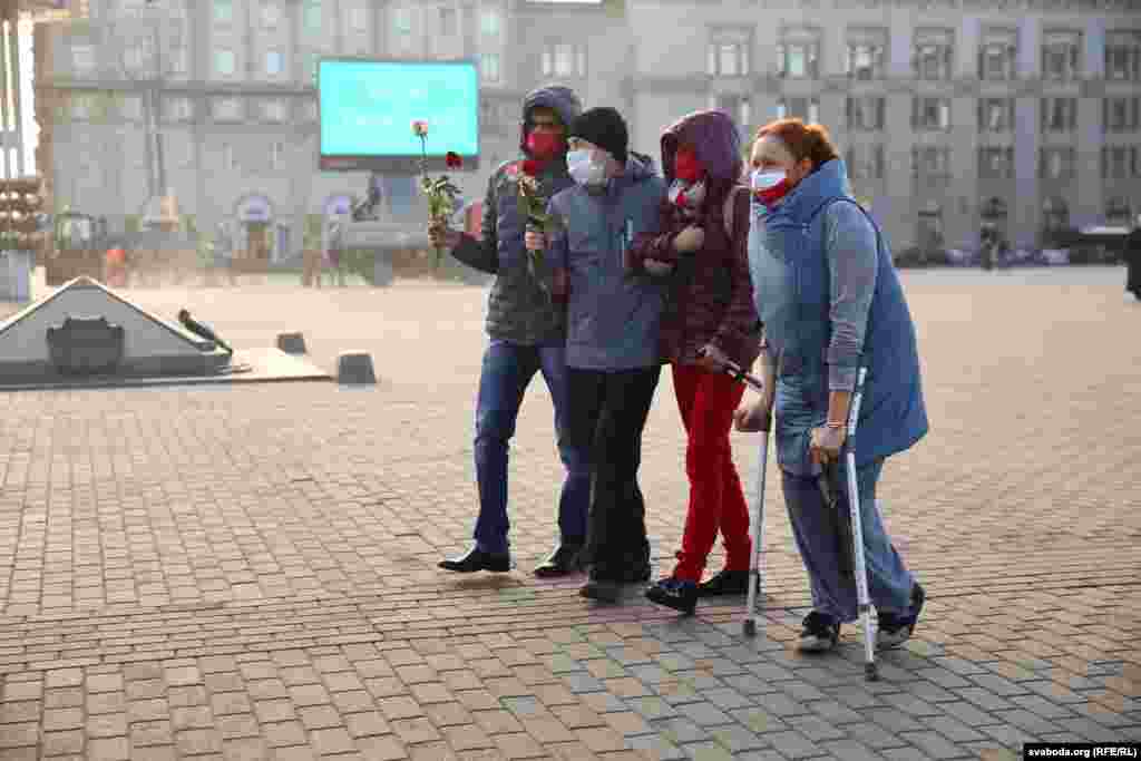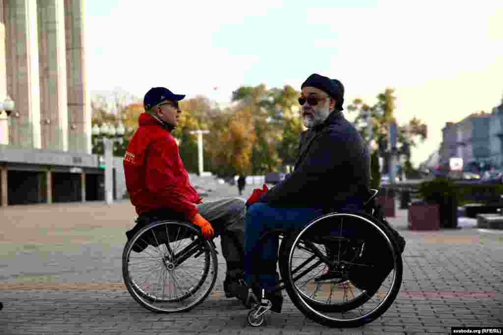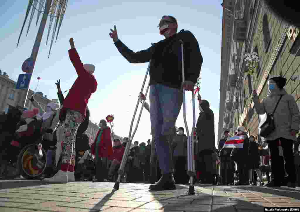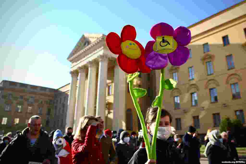 Білоруси з інвалідністю несли квіти і заборонені біло-червоно-білі прапори опозиції, коли мирно проходили вулицями Мінська 22 жовтня під час опозиційного заходу під назвою «Марш людей з нескінченними можливостями».