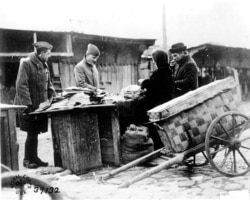 Російський селянин, «знесилений від голоду», сидить на сходах штабу США в Архангельську.