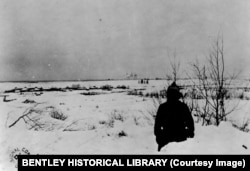 Американський солдат дивиться на село Шенкурськ, яке контролювали більшовики. Американські позиції більшовики захопили через два тижні після цього знімку.