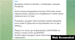 «Висадили повністю автобус із чоловіками та жінками. Різний вік. Коли почали висаджувати хлопців 18-35 років, жінки підняли паніку, оркам це не сподобалося, і таким чином провчили всіх, хто їхав» (22.09.22)
