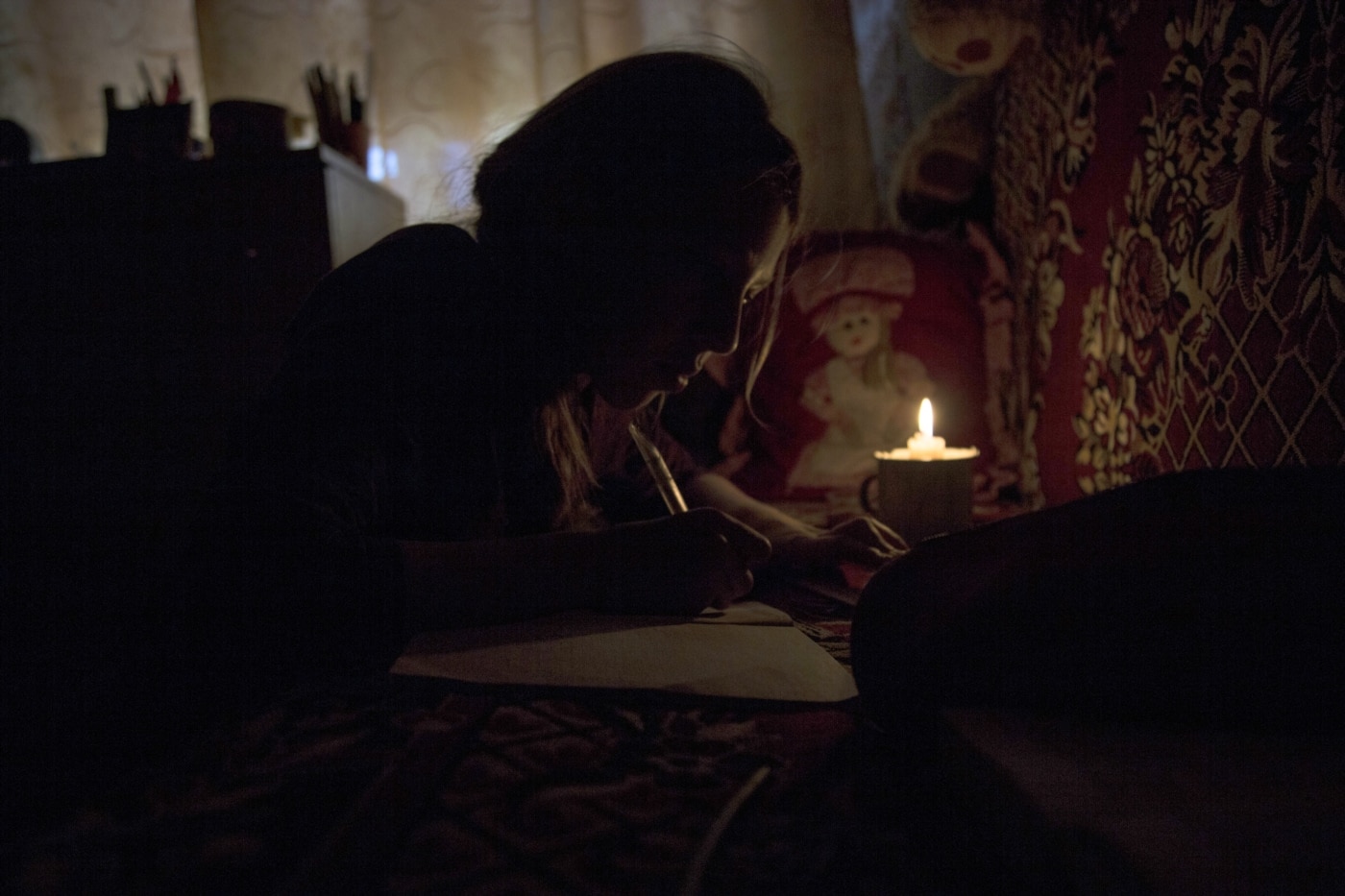Тут темнувато й складно розгледіти навіть колір написаного. Школярка робить домашнє завдання: одним оком глянула в книжку, іншим – у зошит. Піднімає голову, приставляє ручку до губ, щось шепоче й пише в зошиті.