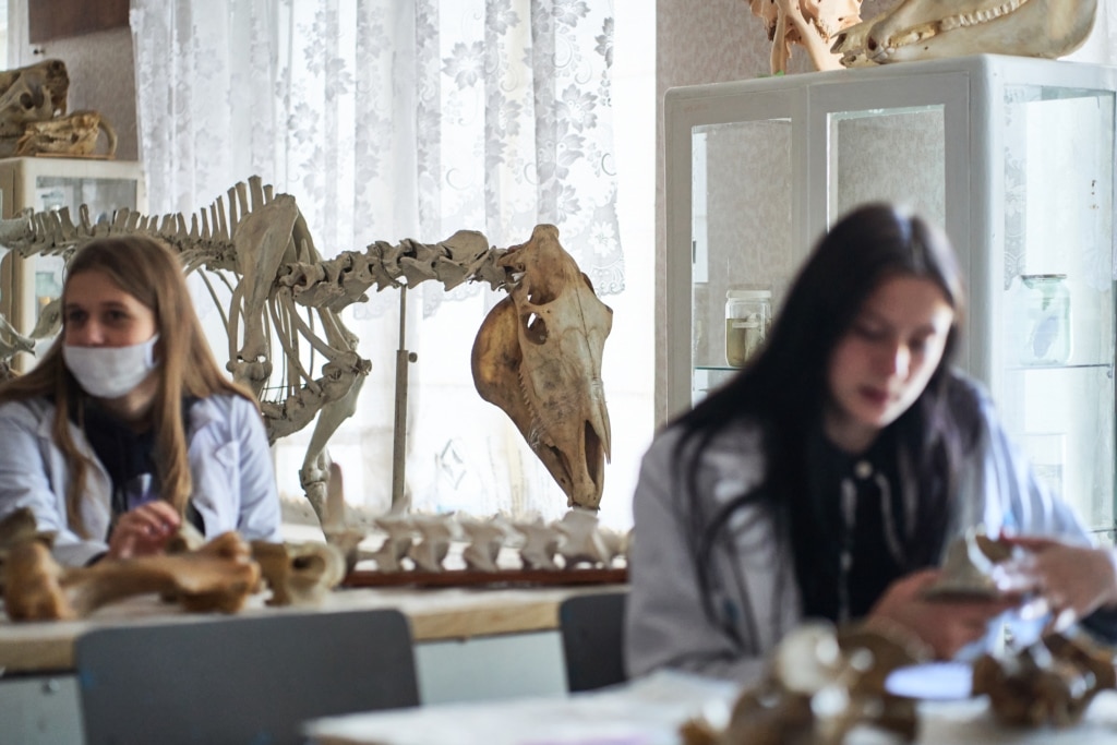 У напівзаповненій аудиторії номер 62 кілька десятків студентів-ветеринарів досліджують анатомію тварин. На скляних стелажах розташовані забальзамовані останки: кістки зап’ястя коней, черепи свиней, скелети рогатої худоби. Все це – навчальні предмети для студентів. Кожен бере по черзі кістку, крутить у руках, щось звіряє із підручником та тихо бубнить під ніс. Пізніше вони по черзі підходять до викладача і відповідають засвоєний матеріал.