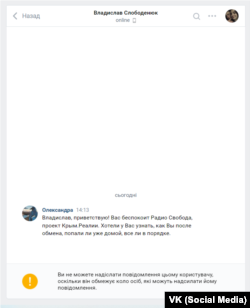 Ми спробували зв'язатися ще з одним військовослужбовцем зі 126-ї обрбо, який був у списку на обмін. Це єфрейтор, стрілець Владислав Слободенюк із Бахчисарая. Його сторінка була відкрита для повідомлень. Прочитавши повідомлення від Крим.Реалії, Владислав Слободенюк одразу ж заблокував можливість писати йому.