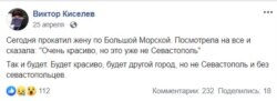 «Сьогодні покатав дружину Великою Морською. Подивилася на все і сказала: Дуже красиво, але це вже не Севастополь. Так і буде. Буде гарно, буде інше місто, але не Севастополь і без севастопольців» – написав на своїй фейсбучній сторінці громадський активіст.