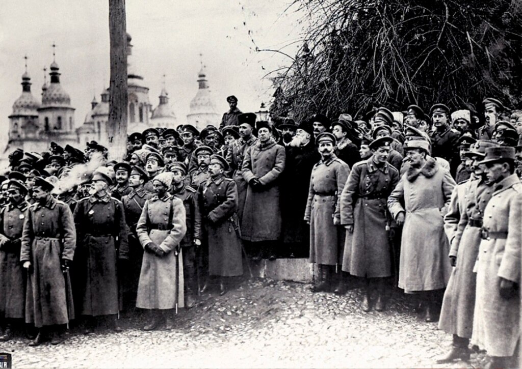Урочистості з нагоди проголошення Української Народної Республіки на софійській площі, осінь 1917 р. (7/20 листопада 1917 р.) Ліворуч: група військових. У центрі (зліва направо): генеральний секретар військових справ Симон Петлюра, голова Генерального секретаріату Володимир Винниченко, голова Центральної Ради Михайло Грушевський. Праворуч: військові та група військових аташе країн Антанти