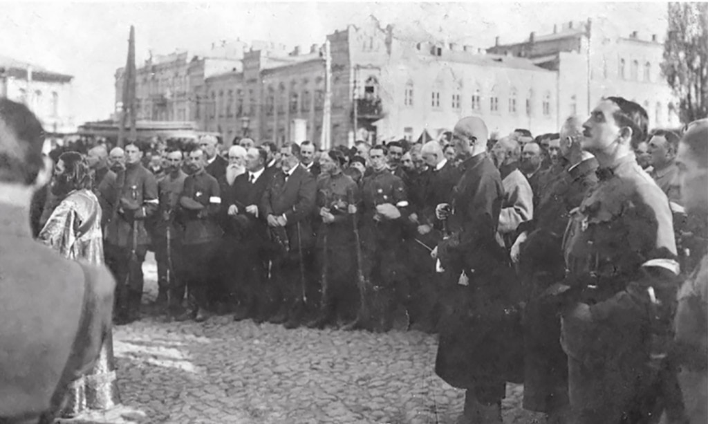 Проголошений гетьманом генерал Павло Скоропадський (в центрі у чорній черкесці) серед своїх прихильників на урочистому молебні на Софійській площі. 29 квітня 1918 року.