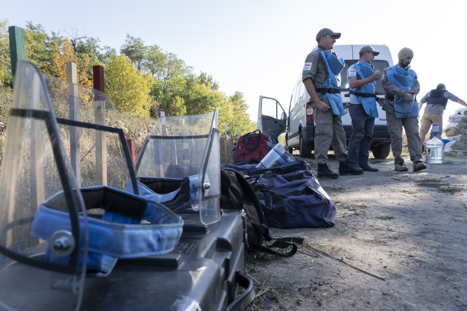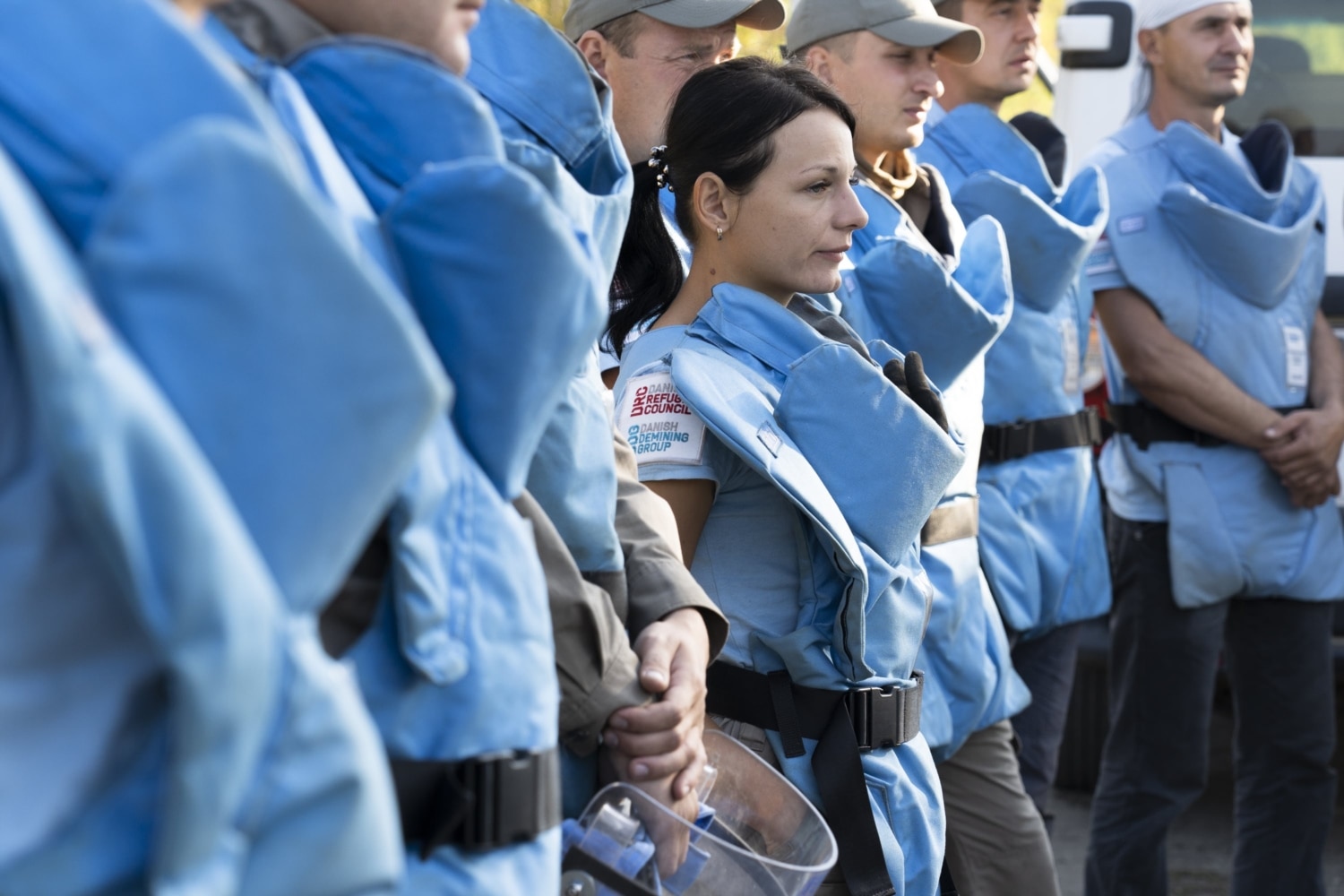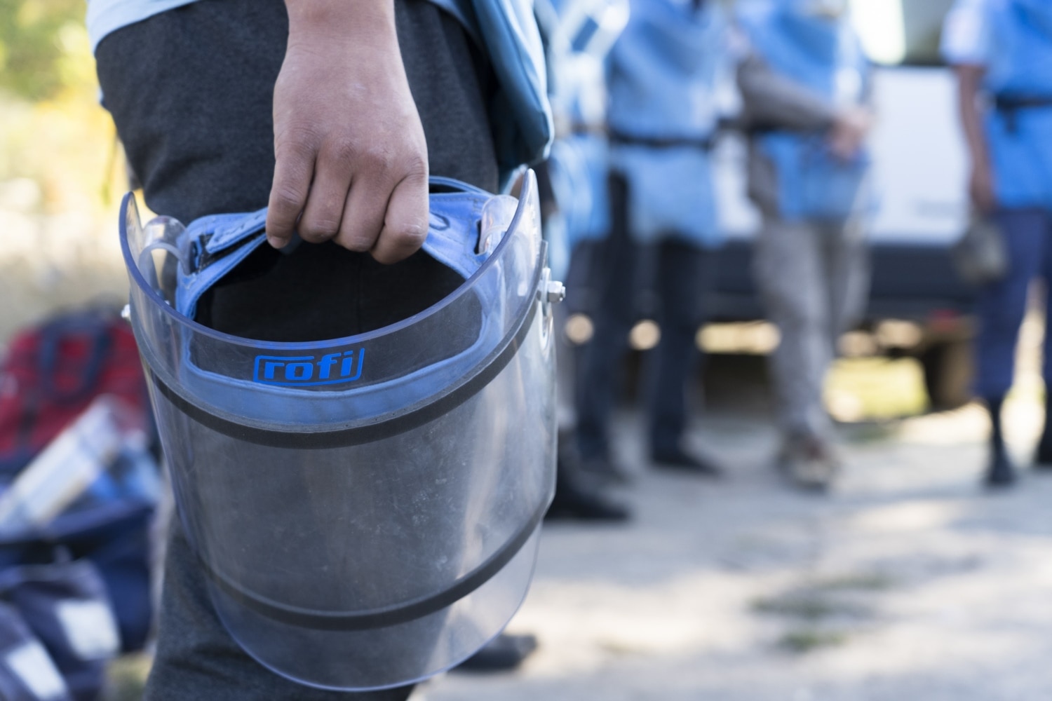 In the event of explosion, protection against fragments should be provided by a Kevlar apron and a visor – that very transparent mask on the face, consisting of two polycarbonate layers. Every deminer puts on this personal protective gear before getting to work. No piece of gear is permitted to take off before the whistle from the group leader, which announces a break.
