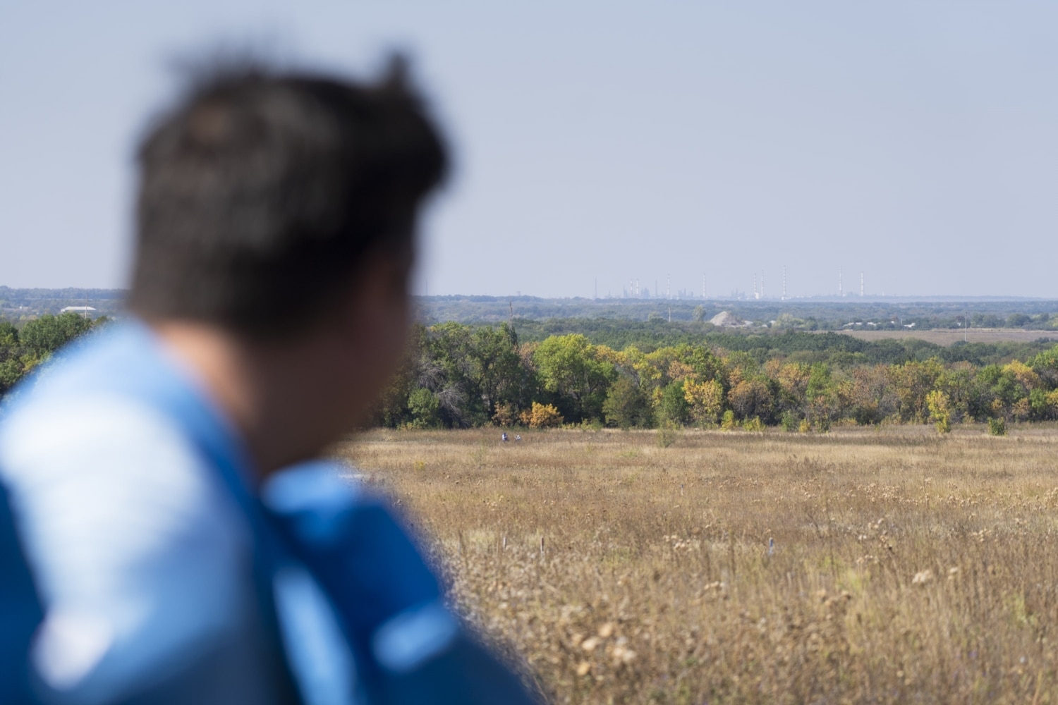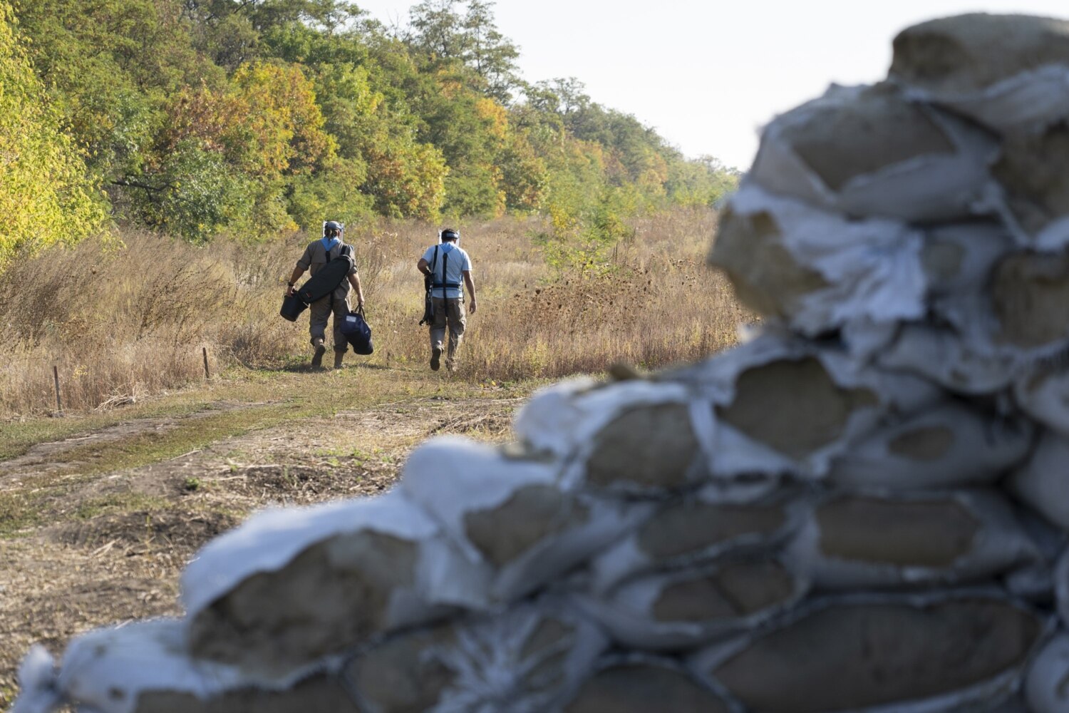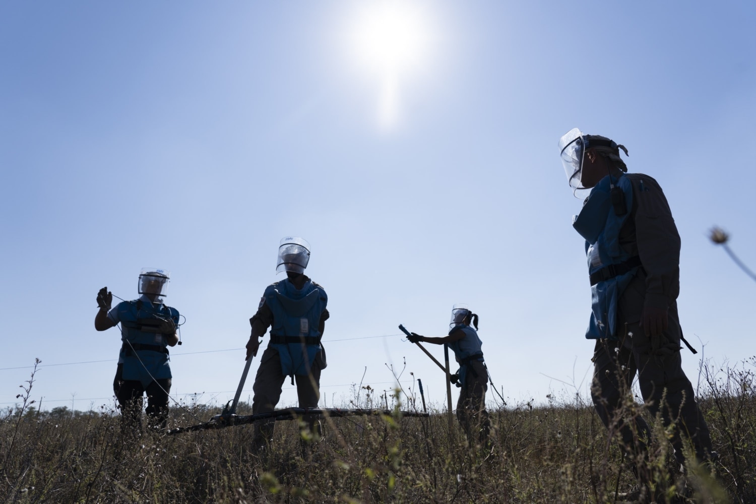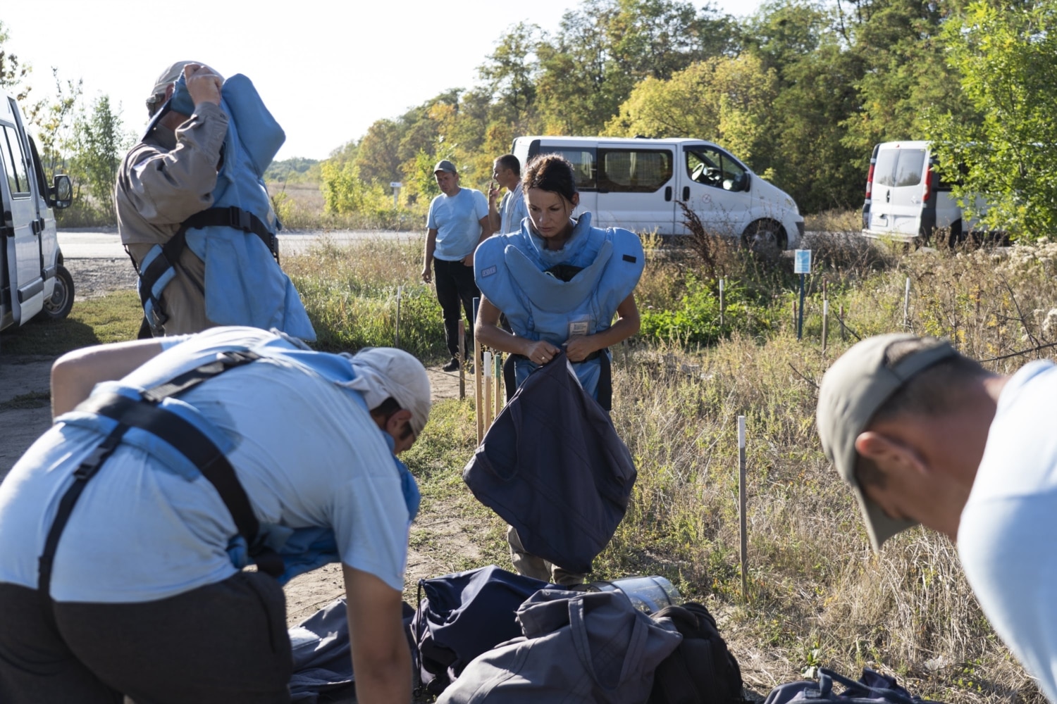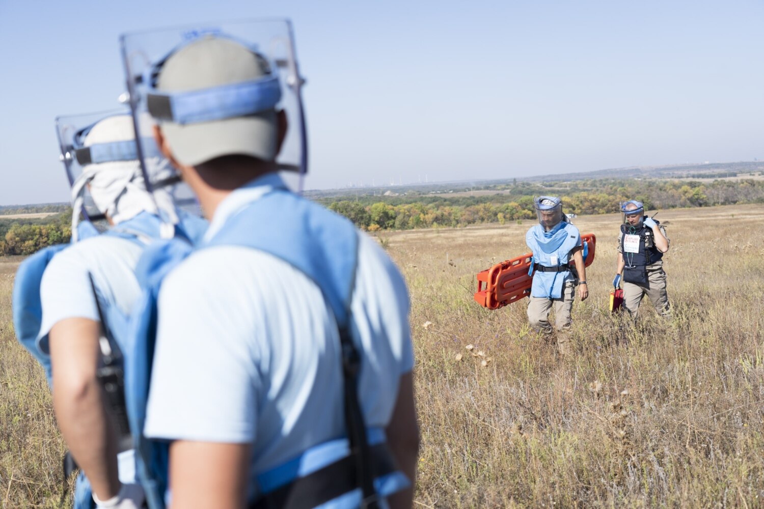 Thorns keep getting into boots, burrs stick to legs. The fragment protection visor gets in the way, constantly sliding down from the head: it’s heavy, and it doesn’t stay in place on the face when you are not used to it. Keeping fast pace, we traverse a hilly terrain, trying not to fall behind the four people carrying a stretcher and the paramedic. The team is training to evacuate a wounded deminer: the medical vehicle is waiting on a clear site, and we are walking to it on the crispy grass among different-color spikes. These spikes are strewn all over the field near the exit from Lysychansk towards Zolote, the last village before the separation line with the occupied territory. The field hadn’t seen a plow in four years; it became a steppe.