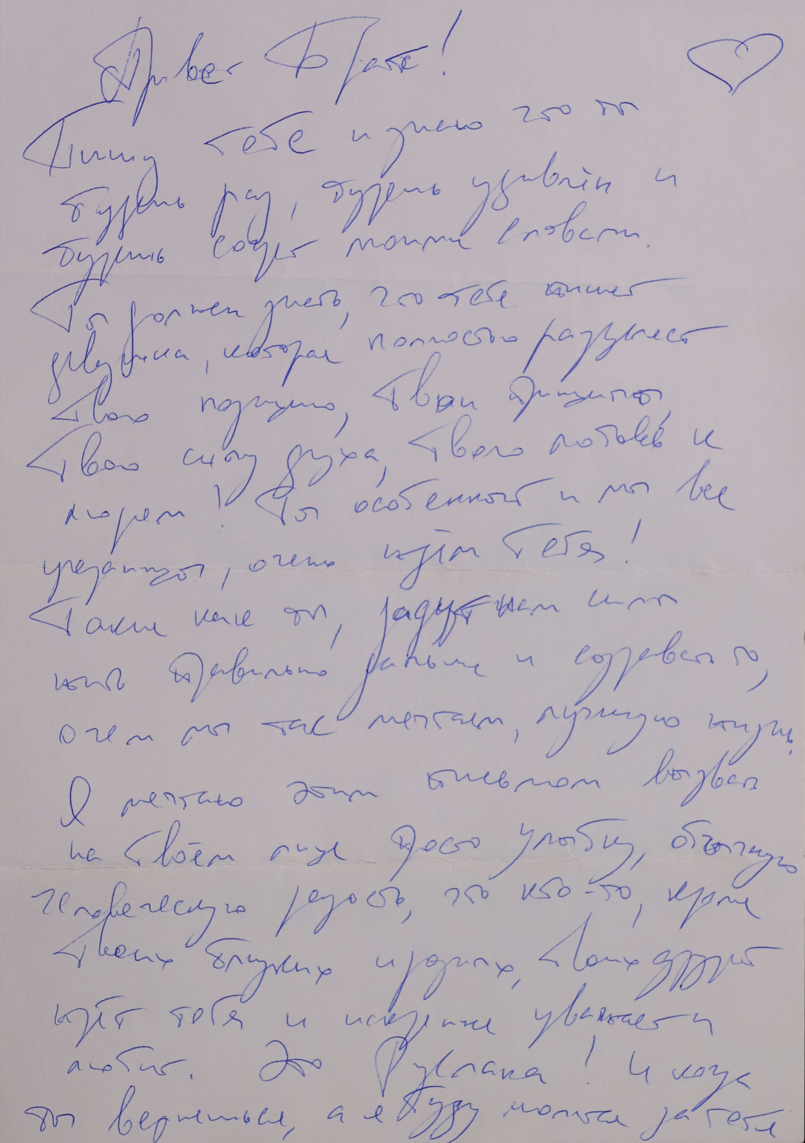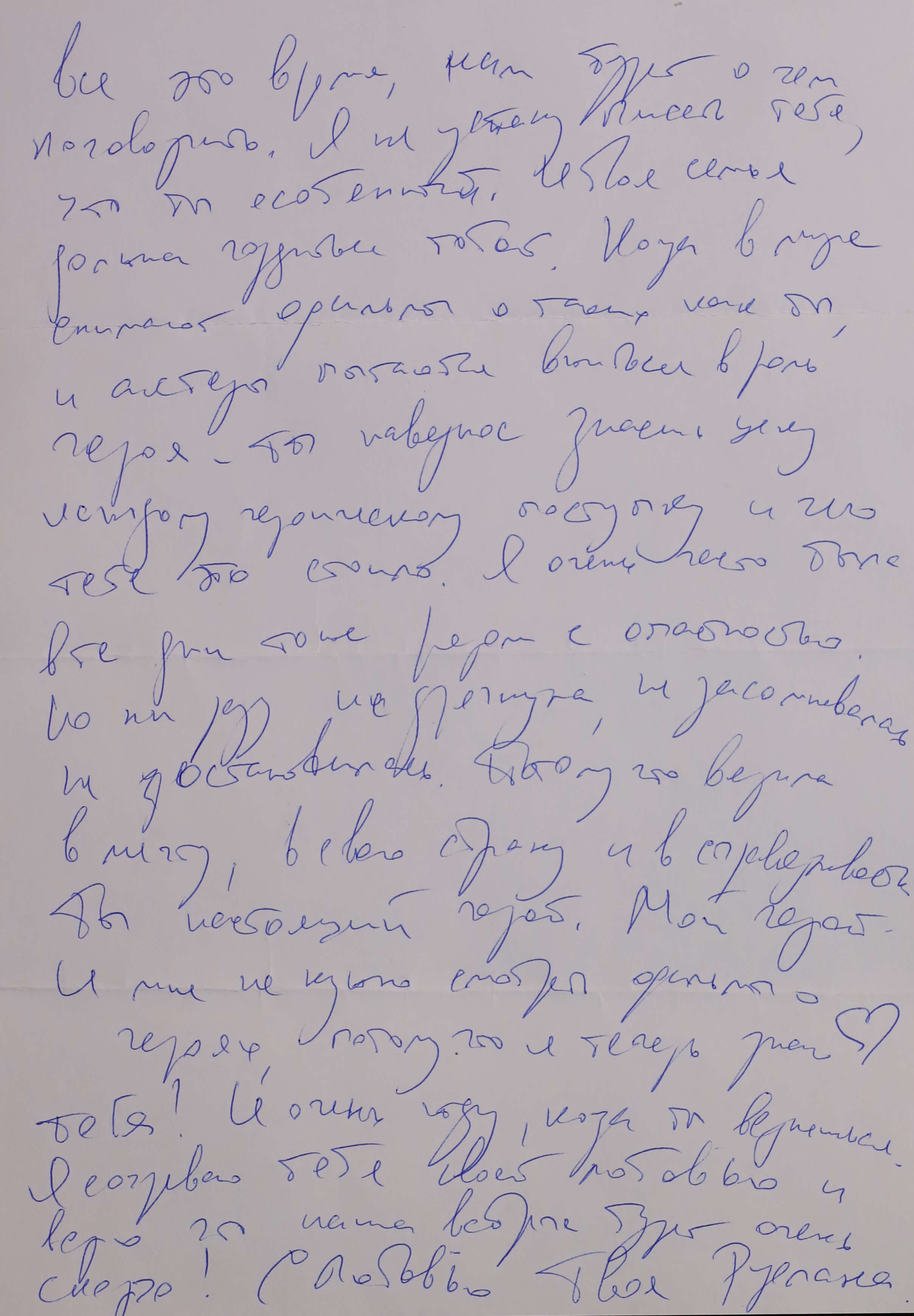 Я мечтаю этим письмом вызвать на твоем лице просто улыбку, обычную человеческую радость, что кто-то, кроме твоих близких, родных и твоих друзей, просто ждет тебя, искренне уважает и любит. Это Руслана. И когда ты вернешься, а я буду молиться за тебя все это время, нам будет о чем поговорить. Я не устану говорить тебе, что ты особенный, твоя семья должна гордиться тобой. Когда в мире снимают фильмы о таких, как ты, и актеры пытаются вжиться в роль героя – ты, наверное, знаешь цену каждому героическому поступку и чего тебе это стоило. Я очень часто тоже была в те дни рядом с опасностью, но ни разу не дрогнула, не засомневалась, не остановилась. Потому что верила в мечту, в свою страну и в справедливость.