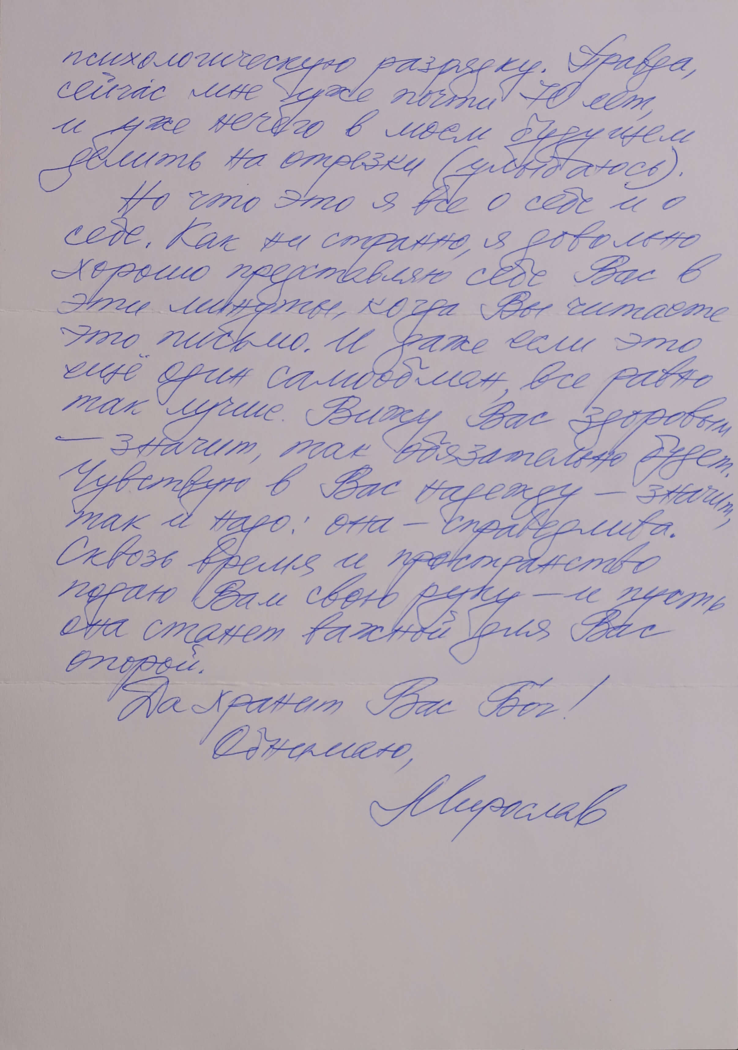 Но мне нравилась эта игра. И я ей благодарен за психологическую разрядку. Правда сейчас мне уже почти 70 лет, и уже нечего в моем будущем делить на отрезки. Но что это я все о себе и о себе? Как ни странно, я довольно хорошо представляю себе Вас в эти минуты, когда Вы читаете это письмо. И даже если это еще один самообман, все равно так лучше. Вижу Вас здоровым – значит, так обязательно будет. Чувствую в вас надежду – значит, так и надо, она справедлива. Сквозь время и пространство подаю Вам свою руку – и пусть она станет важной для Вас опорой.