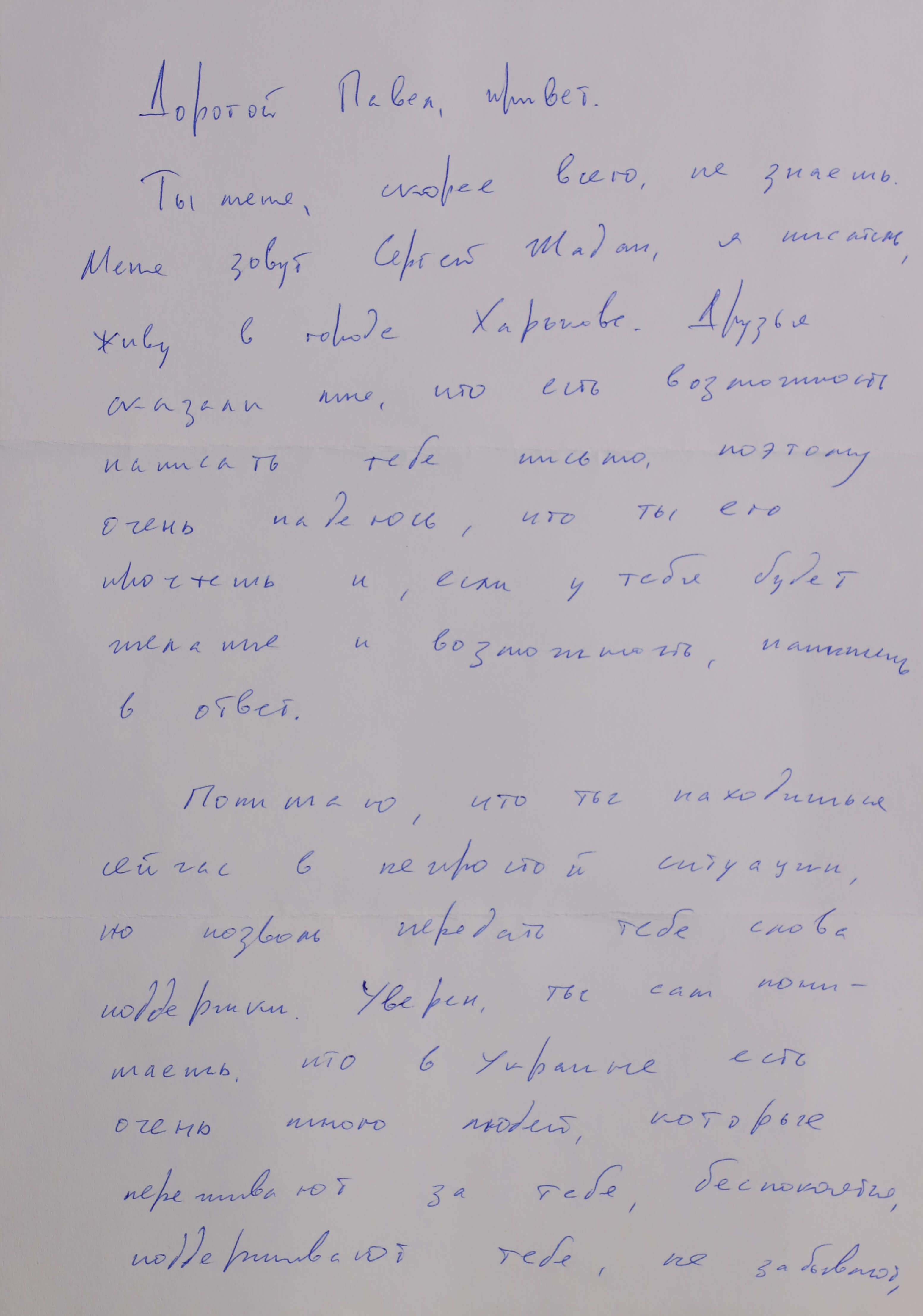 Ты меня, скорее всего, не знаешь. Меня зовут Сергей Жадан, я писатель, живу в городе Харькове. Друзья сказали, что есть возможность написать тебе письмо, поэтому очень надеюсь, что ты его прочтешь и, если у тебя будет желание и возможность, напишешь в ответ.