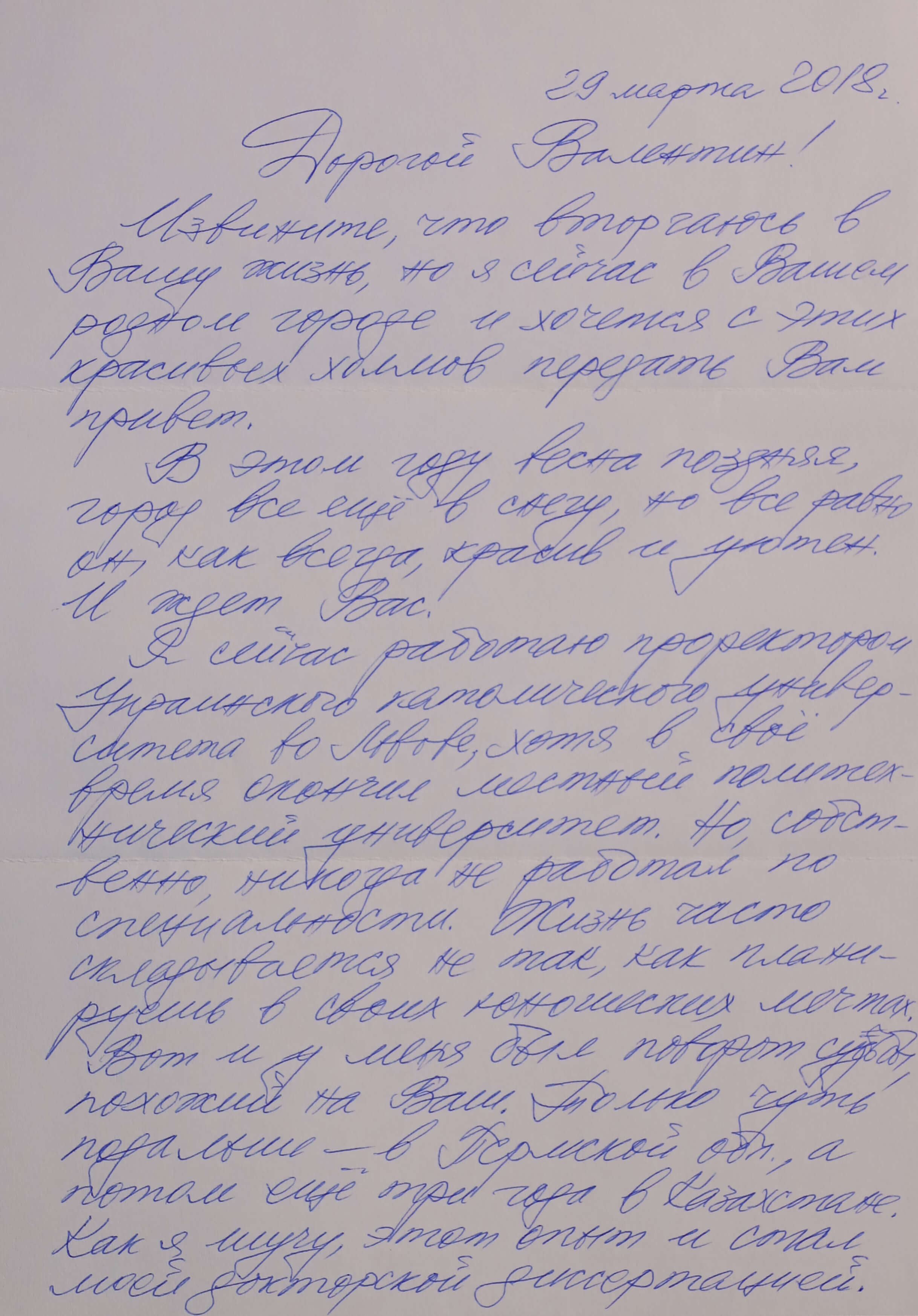 Извините, что вторгаюсь в Вашу жизнь, но я сейчас в Вашем родном городе и хочется с этих красивых холмов передать Вам привет. В этом году весна поздняя, город все еще в снегу, но все равно он, как всегда, красив и уютен. И ждет Вас. Я сейчас работаю проректором Украинского католического университета во Львове, хотя в свое время окончил местный политехнический университет. Но, собственно, никогда не работал по специальности. Жизнь часто складывается не так, как планируешь в своих юношеских мечтах. Вот и у меня был поворот судьбы, похожий на Ваш, только чуть подальше – в Пермской области, а потом еще три года в Казахстане. Как я шучу, этот опыт и стал моей докторской диссертацией.