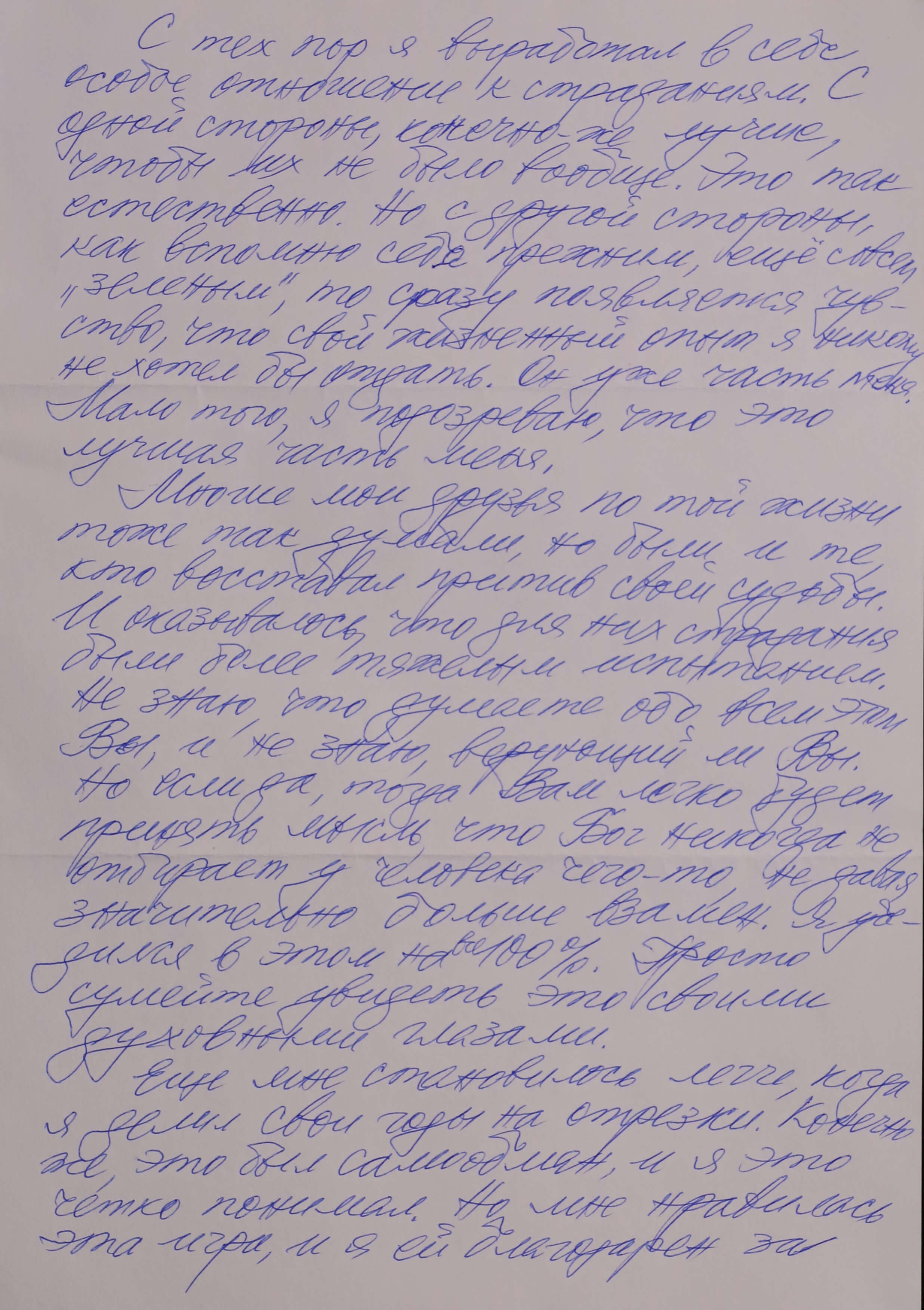 С тех пор я выработал в себе особое отношение к страданиям. С одной стороны, конечно же лучше, чтоб их не было вообще. Это так естественно. Но с другой стороны, как вспомню себя прежнем, еще совсем «зеленым», то сразу появляется чувство, что свой жизненный опыт я никому не хотел бы отдать. Он уже часть меня. Мало того, я подозреваю, что это лучшая часть меня. Многие мои друзья по той жизни тоже так думали. Но были и те, кто восставал против своей судьбы. И оказывалось, что для них, страдания были более тяжелым испытанием. Не знаю, что думаете об этом всем Вы. И не знаю, верующий ли Вы. Но если да, то Вам легко будет принять мысль, что Бог никогда не отбирает у человека чего-то, не давая чего-то значительно больше взамен. Я убедился в этом на все 100%. Просто сумейте увидеть это своими духовными глазами. Еще мне становилось легче, когда я делил свои годы на отрезки. Конечно же это самообман. И я это четко понимал.