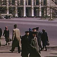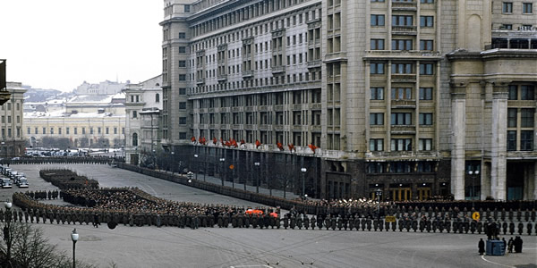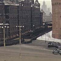 На одній із численних плівок, знятих із балкону американського посольства, який виходив на Кремль, зображені піонери, які марширують щільною колоною через Манежну площу під час першотравневої демонстрації.