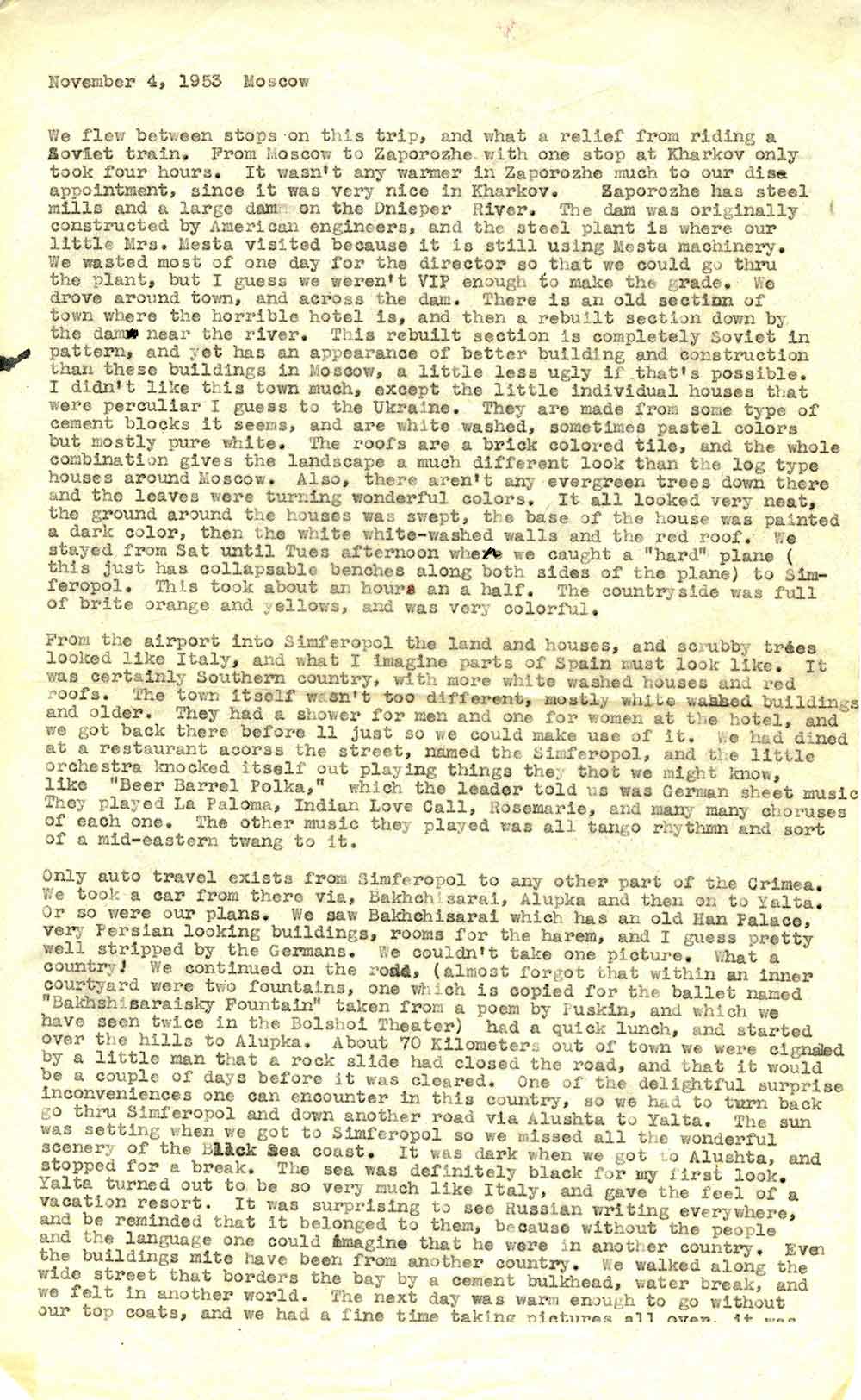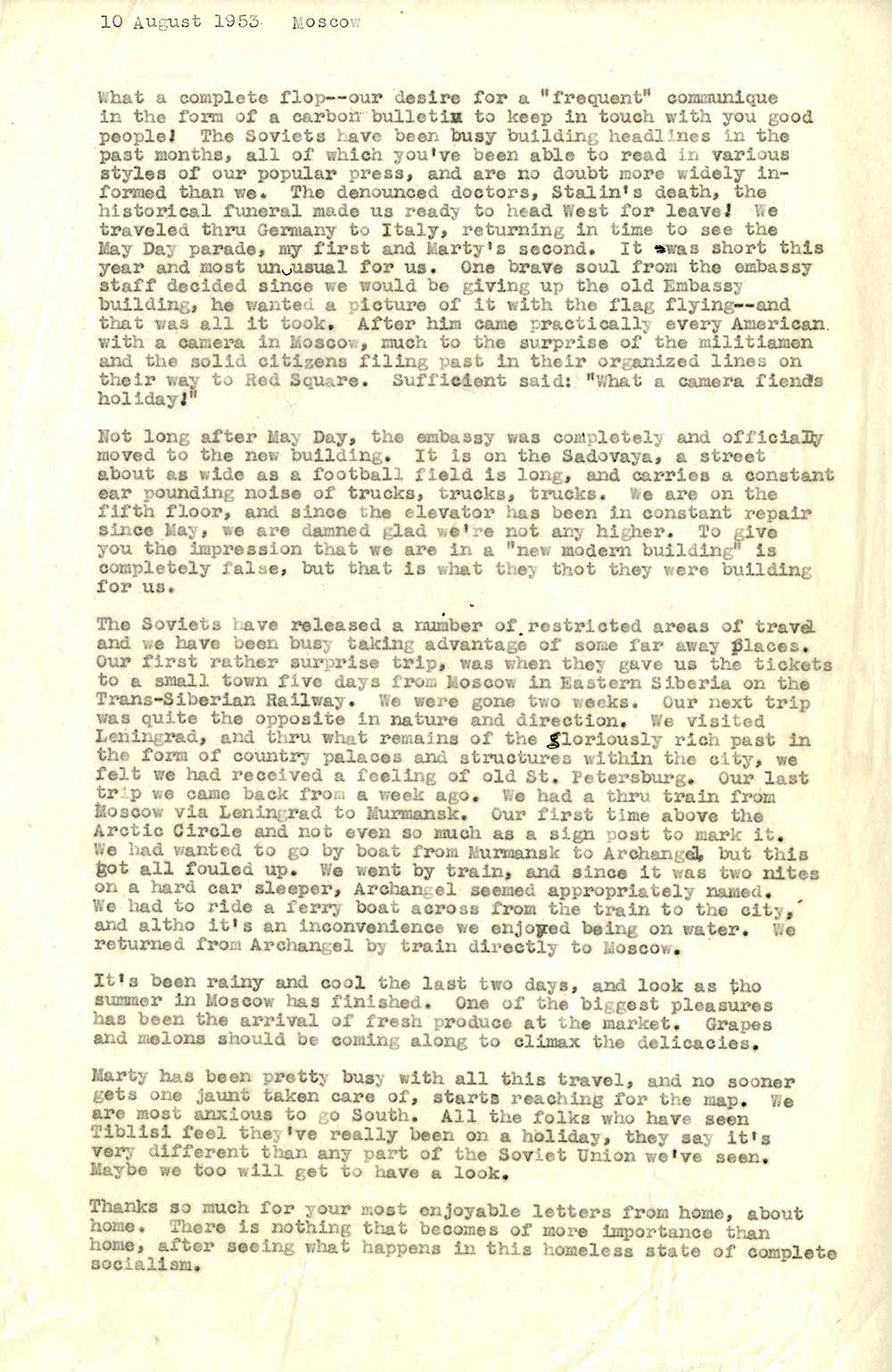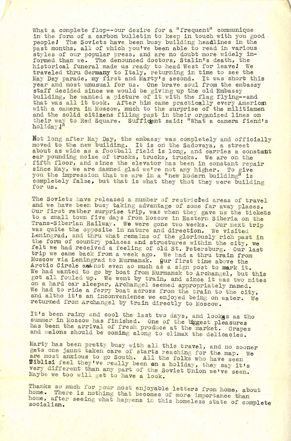 Усі наші плани регулярно інформувати вас, дорогі мої, про те, що тут відбувається, зазнали повного провалу. Радянські новини вже кілька місяців не сходять з перших шпальт світових газет; з різноманітних повідомлень нашої преси ви напевно знаєте більше, ніж ми тут. Лікарі-вбивці, смерть Сталіна, історичний похорон – тут стільки всього відбувається, що ми вже готові були просити відпустку, щоб більше дізнатися про це на Заході.