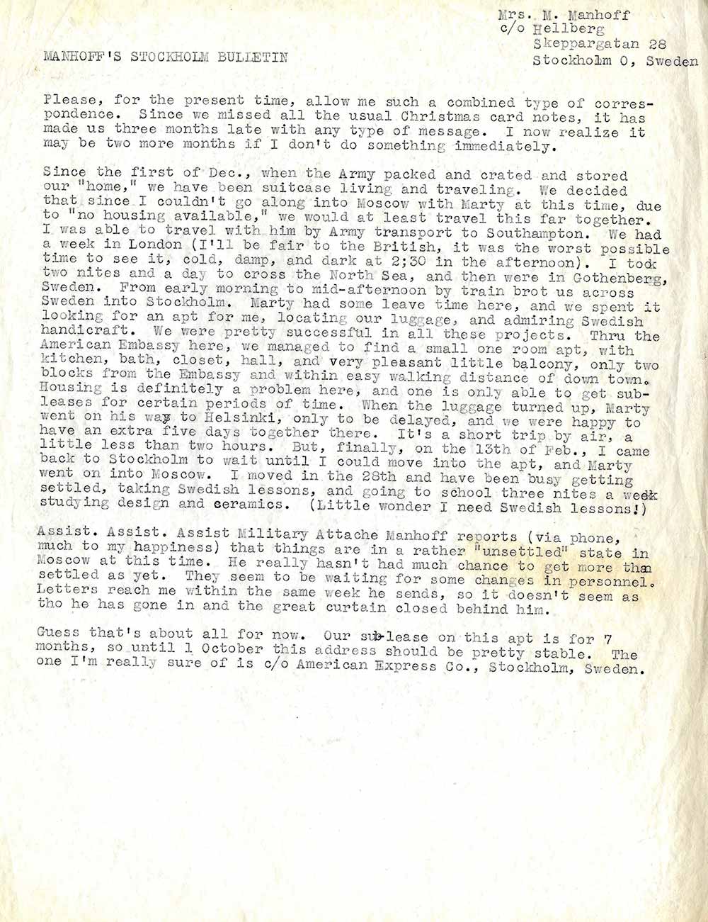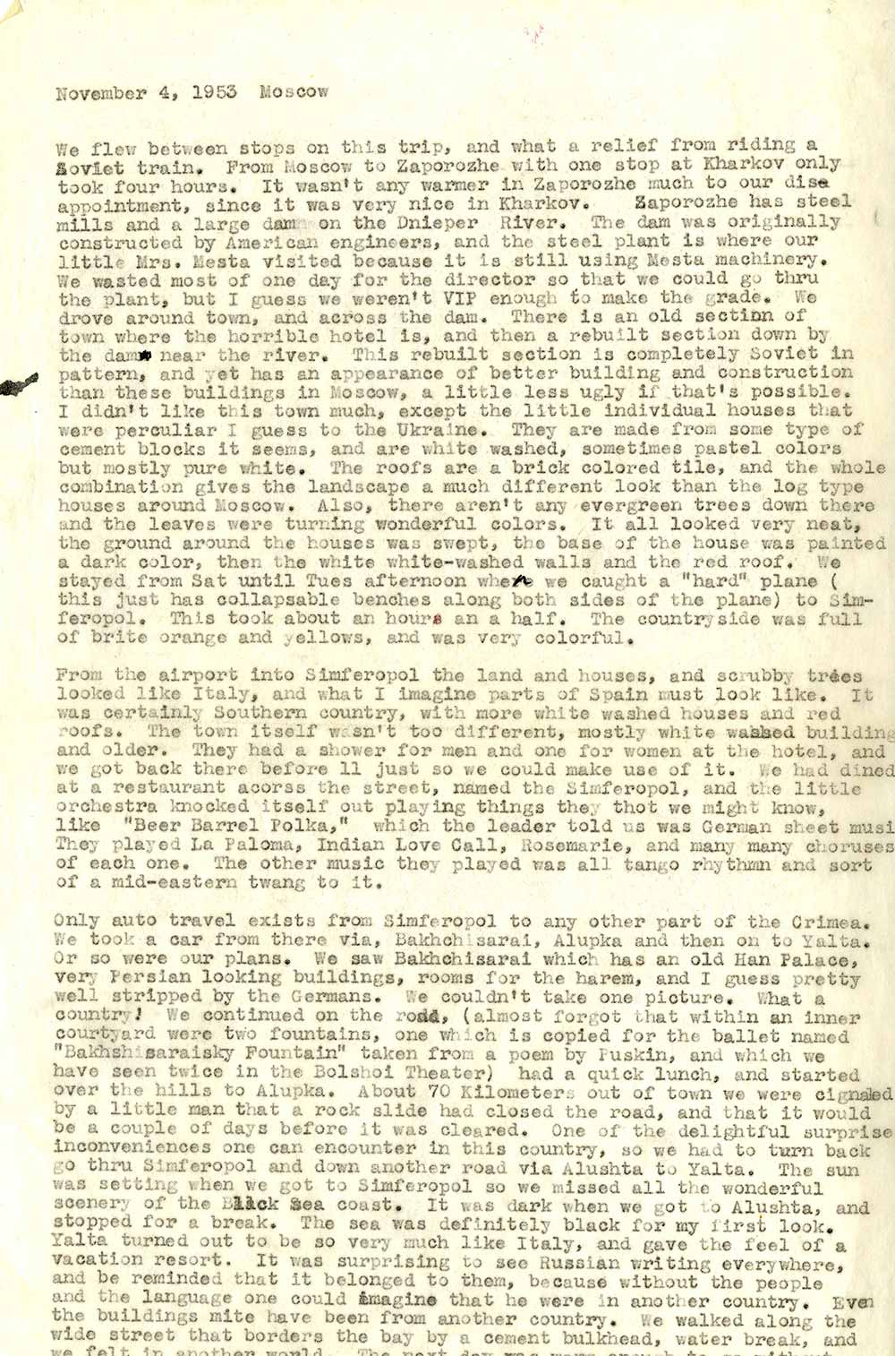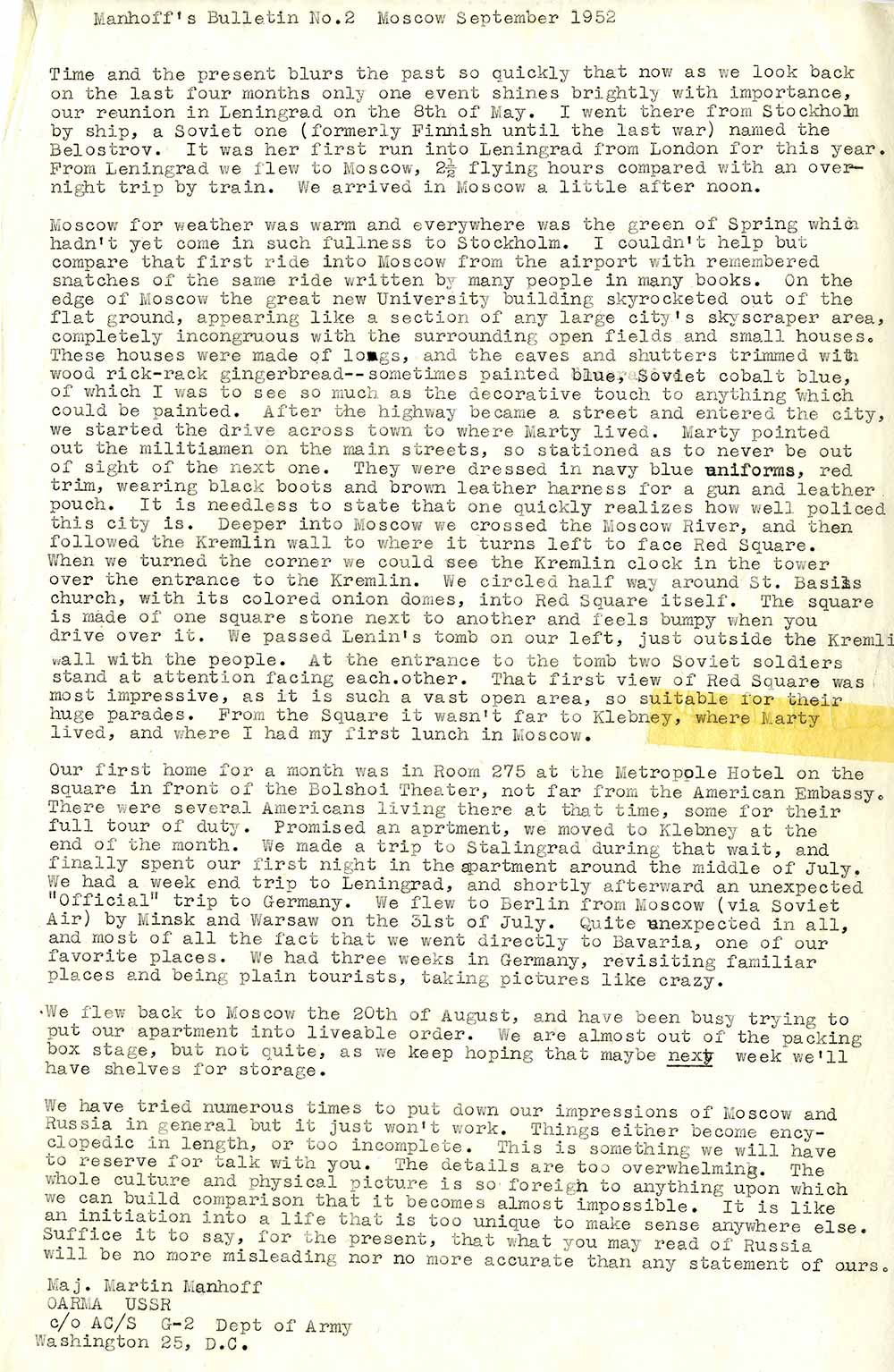 Усі наші плани регулярно інформувати вас, дорогі мої, про те, що тут відбувається, зазнали повного провалу. Радянські новини вже кілька місяців не сходять з перших шпальт світових газет; з різноманітних повідомлень нашої преси ви напевно знаєте більше, ніж ми тут. Лікарі-вбивці, смерть Сталіна, історичний похорон – тут стільки всього відбувається, що ми вже готові були просити відпустку, щоб більше дізнатися про це на Заході.