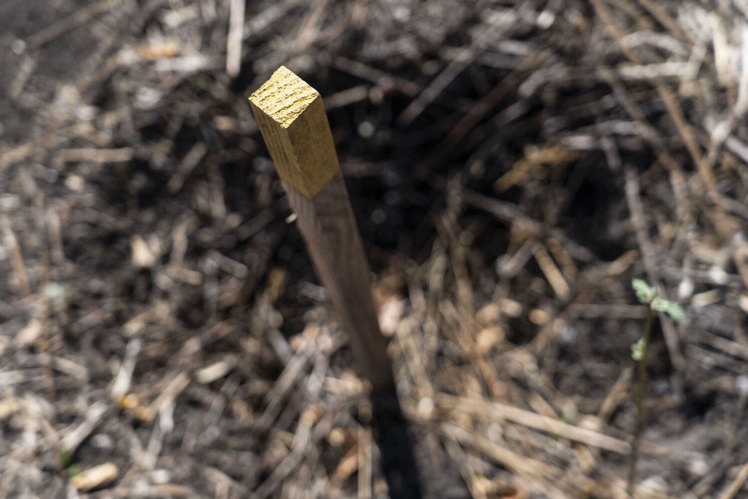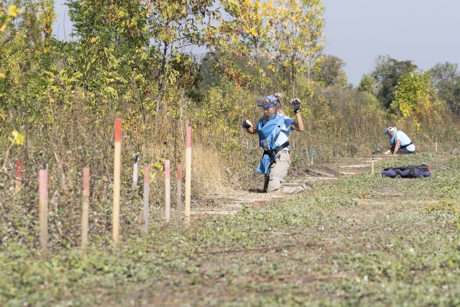 «Білий – це наша адмінзона, тобто безпечна територія, – пояснює team leader (керівник групи, в DDG як західній компанії поміж собою частіше застосовують англійські назви позицій) Павло. – Зеленим ми вимірюємо очищену територію, він ставиться через кожні 100 метрів. Жовтий означає, що тут був знайдений і утилізований боєприпас. Червоний – межа безпечної і небезпечної території, а також повороти, тоді поруч ставляться два коротші кілки. Також ці кілки закривають проходи. Синій – це кілок прогресу: коли сапер зранку починає працювати, він виставляє цей кілок на те місце, де він почав. Сірий смугастий означає контроль якості командиром секції. Після нього перевіряє командир групи, тобто я – це чорний кілок».